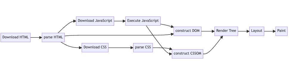 HTML ファイルが描画されるまでの流れは以下のようになっており、 HTML の解析、CSS の解析をしたのち Render Tree を構築し、Layout 作業でHTML の各 node のサイズと位置を計算し、Painting にて結果のレンダリングが行われます。