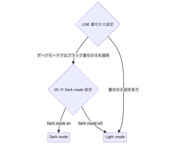 LINE アプリでのダークモード設定は、アプリ起動時にローカルデータベースに保存された「着せかえ」の情報と Android 端末のダークモード設定を以下の流れにより決定し、 AppCompatDelegate.setDefaultNightMode を呼び出すことで設定しています。