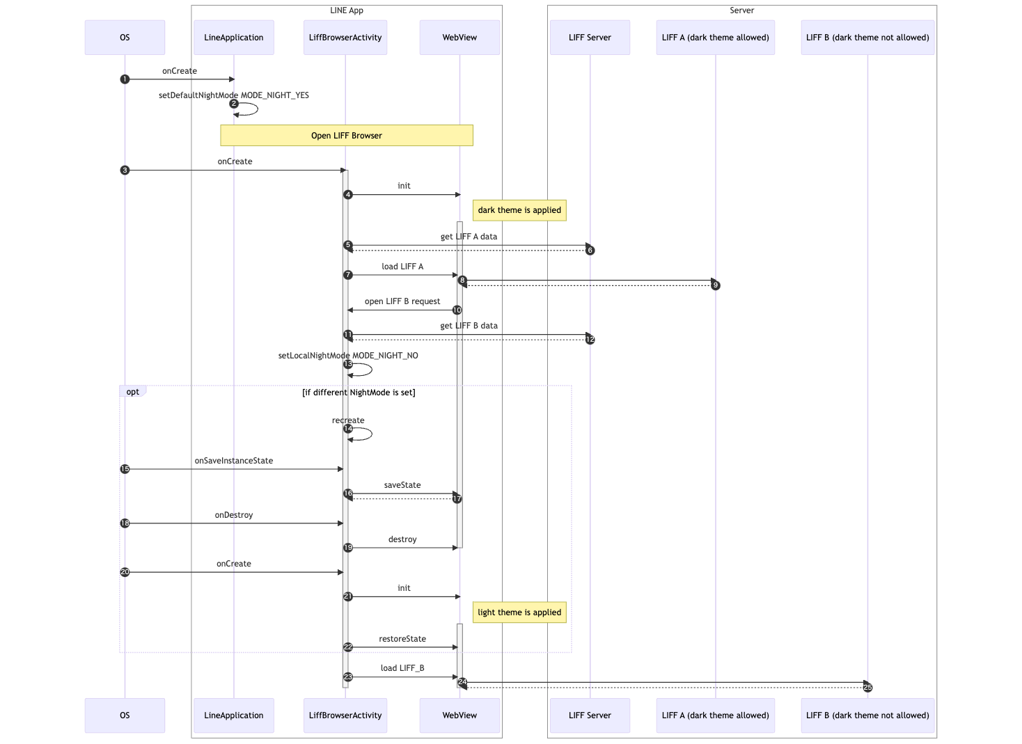 最初に開かれた LIFF アプリがダークテーマの利用を許可されおり、次に開いた LIFF アプリには許可されていないような場合では、WebView を開いている Activity 上で動的にテーマの変更が必要となるのですが、setLocalNightMode は Activity の onCreate でしか設定値の反映させることができない制限があり、その他の場所から呼び出した場合は Activity を recreate する必要があります。