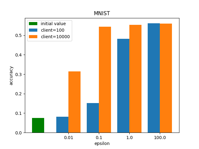 背景知識で紹介した通り、分散差分プライバシーではサーバー側で集約した時にセントラル差分プライバシーで加えるノイズと同等のノイズになるように個々のクライアントがノイズを乗せます。このようなノイズの乗せ方をするとクライアントの数が多ければ多いほど一つのクラアントで加えるノイズの量が小さくなります。クライント数が100の時と10000の時を比較します。クライアント数が10000の時は