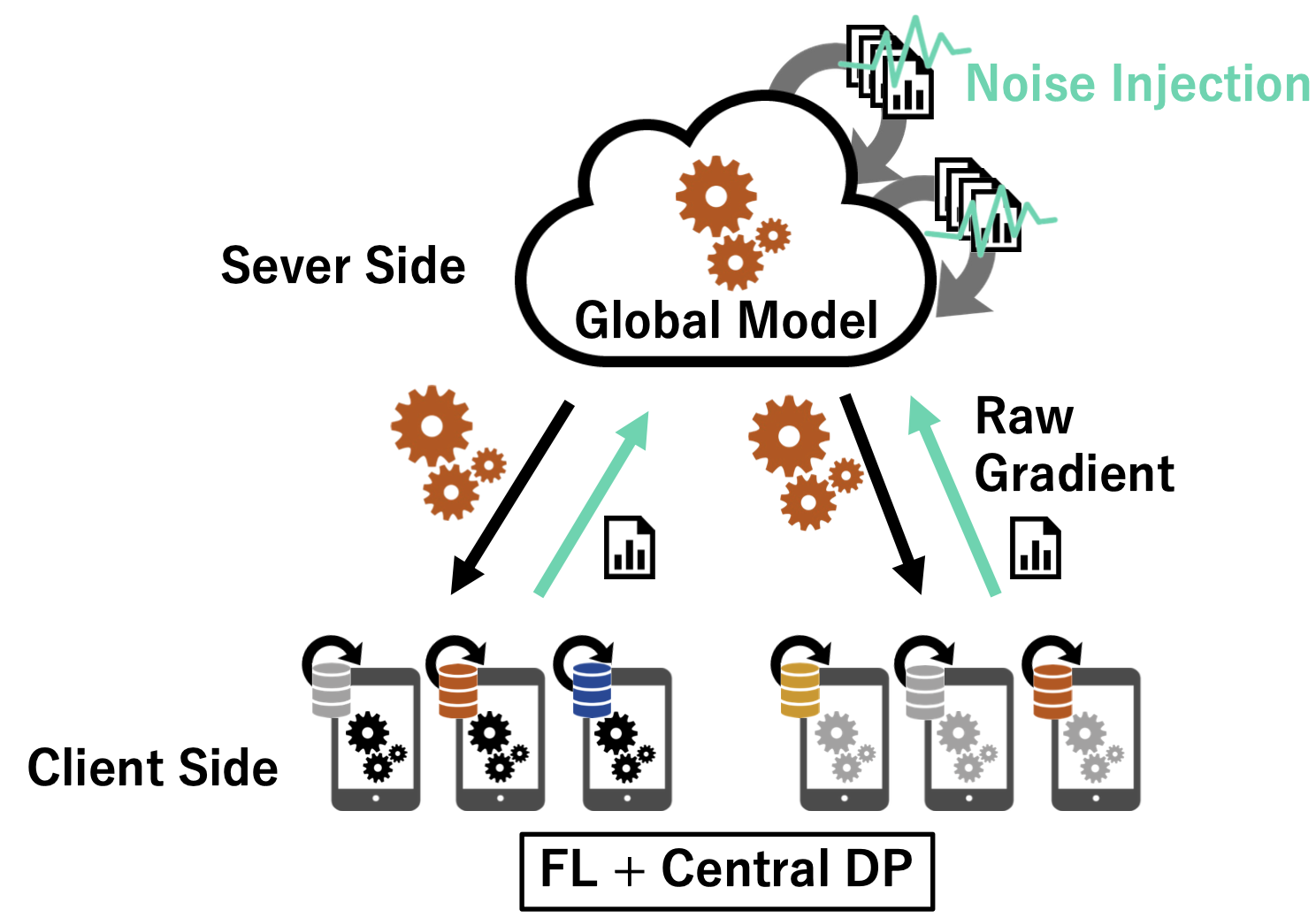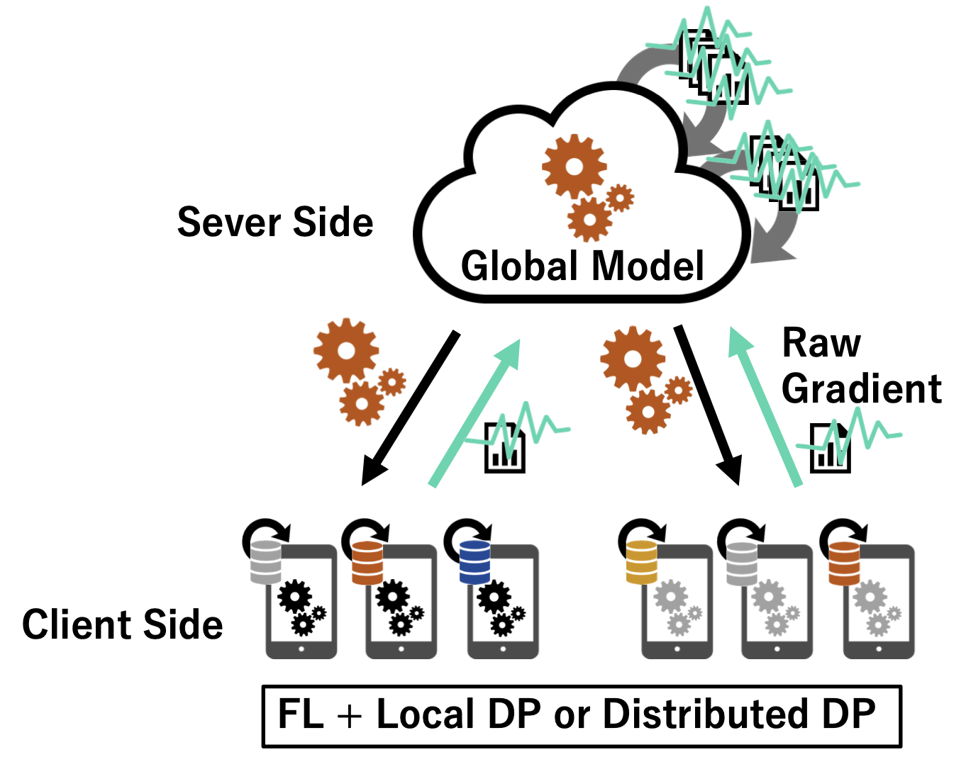 - その後、多数のクライアントがデータではなく、勾配や重みの差分などの情報をサーバーに送ります。この時に勾配や重みの差分などの情報に分散差分プライバシーの概念に基づきノイズを加えてDPを保証できるようにします。