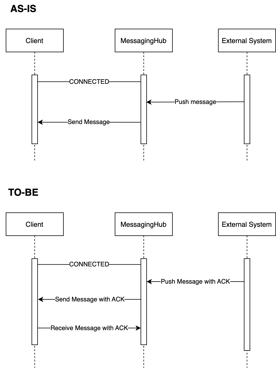 이 문제를 해결하기 위해 MessagingHub로부터 받은 메시지에 ACK 인증 토큰 정보가 있다면 클라이언트에서 REST API로 서버를 호출해 메시지 수신 여부를 기록하는 작업이 필요해졌습니다. MessagingHub를 이용하는 모든 프로덕트에 적용해야 하는 요구 사항이었는데요. 각 제품 클라이언트 담당자가 각자 이슈 사항을 파악해 요구 사항에 맞춰 개발했습니다. 이에 따라 공통적으로 필요한 처리 로직을 개발하기 위해 리소스가 중복으로 사용됐고, 프로덕트별로 요청 사항 반영이 누락되는 경우가 발생하기도 했습니다.