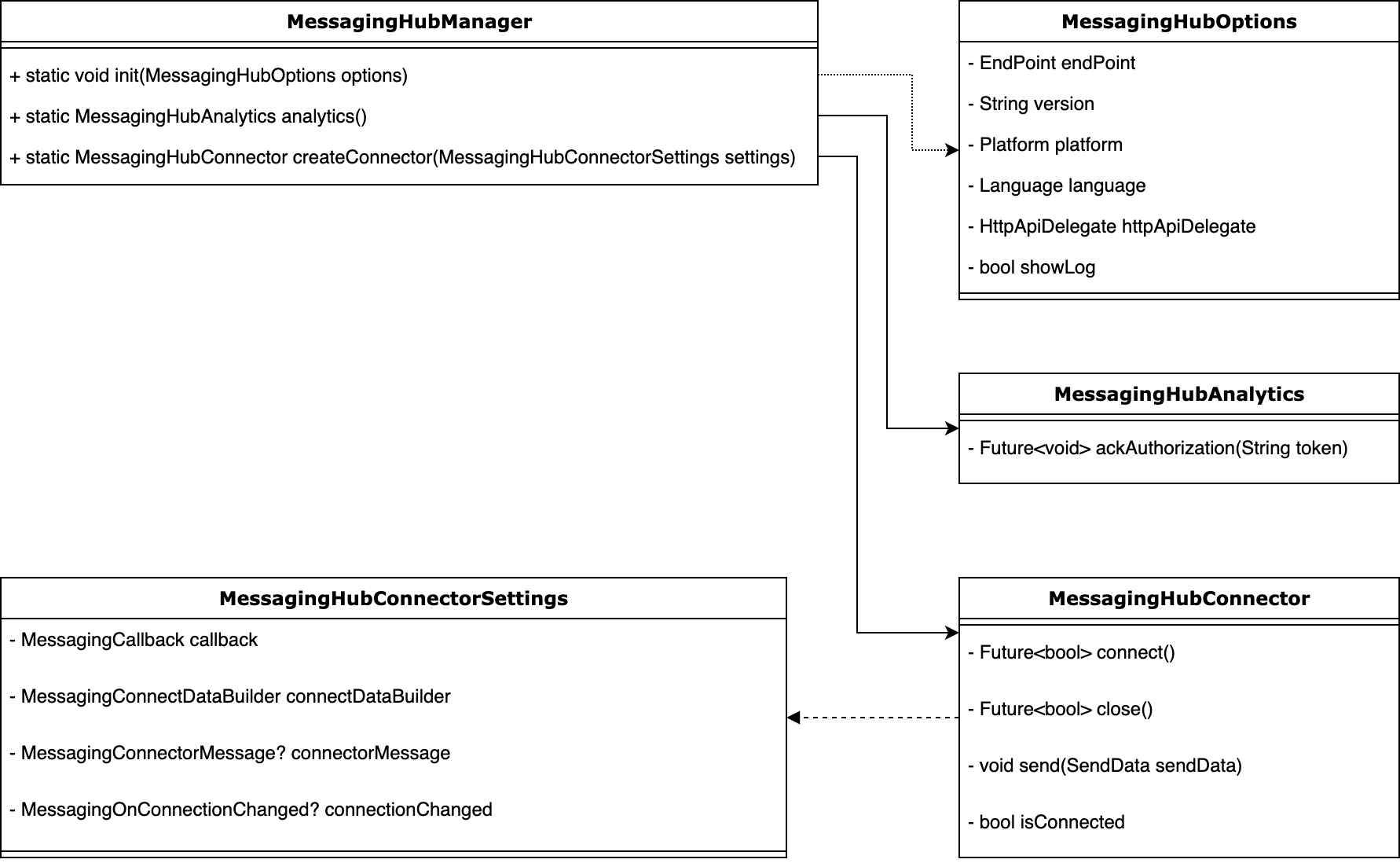 초기화 후 MessagingHubConnector와 MessagingHubAnalytics를 생성하면 다음과 같은 기능을 활용할 수 있습니다.