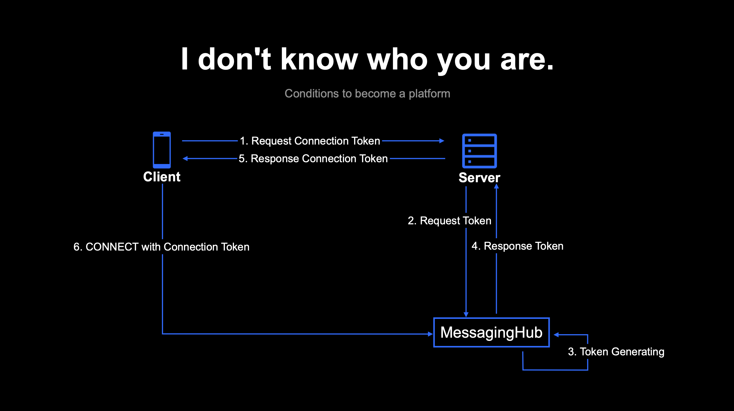 MessagingHub에 접속하려면 인증 토큰이 필요합니다. DriverApp이 DeliveryEngine에 인증 토큰 발급을 요청하면 DeliveryEngine은 이 요청을 MessagingHub로 전달하고 MessagingHub에서 인증 토큰을 생성합니다. 생성한 토큰은 다시 DeliveryEngine을 통해 DriverApp으로 전달됩니다. 이 인증 토큰을 이용해 DriverApp에서 웹소켓으로 MessagingHub에 연결 후 미리 약속된 'CONNECT'라는 메시지를 전달합니다.