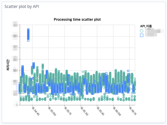 일부 요청의 처리 시간이 다른 요청 대비 오래 걸렸다는 것을 산포도를 통해 쉽게 인지할 수 있는 예