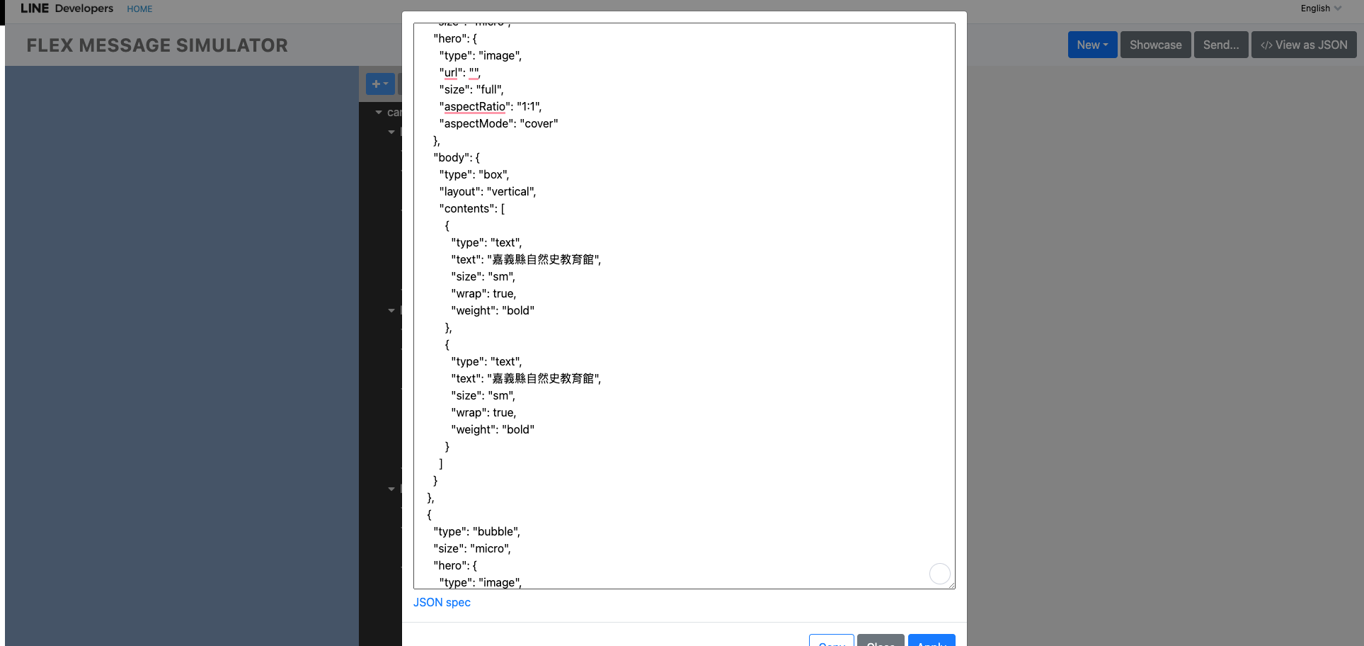 這段程式碼給一個範例,當你發送訊息錯誤的時候。這時候,就把你的錯誤的 FLEX Message JSOM 印出來。然後一樣複製下來後,到 FLEX Simulator 一樣打開 “View as JSON” 然後放上 JSON 並且套用。
