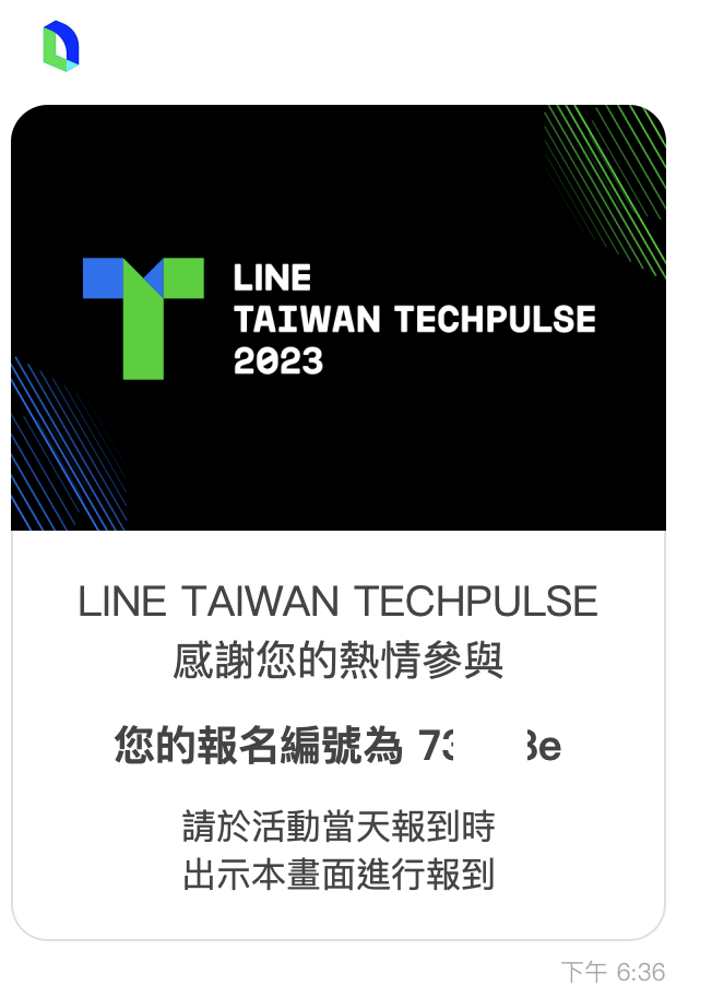 活動當天請出示上圖 Flex Message 畫面,待工作人員確認後,即可獲得現場 Badge 一枚,活動當天需配戴此 Badge,即可自由於 A, B 兩廳移動。